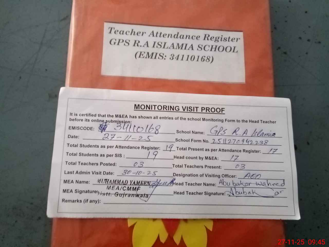| Attendance Register | Head Teacher | MEA with School | Visit Proof |