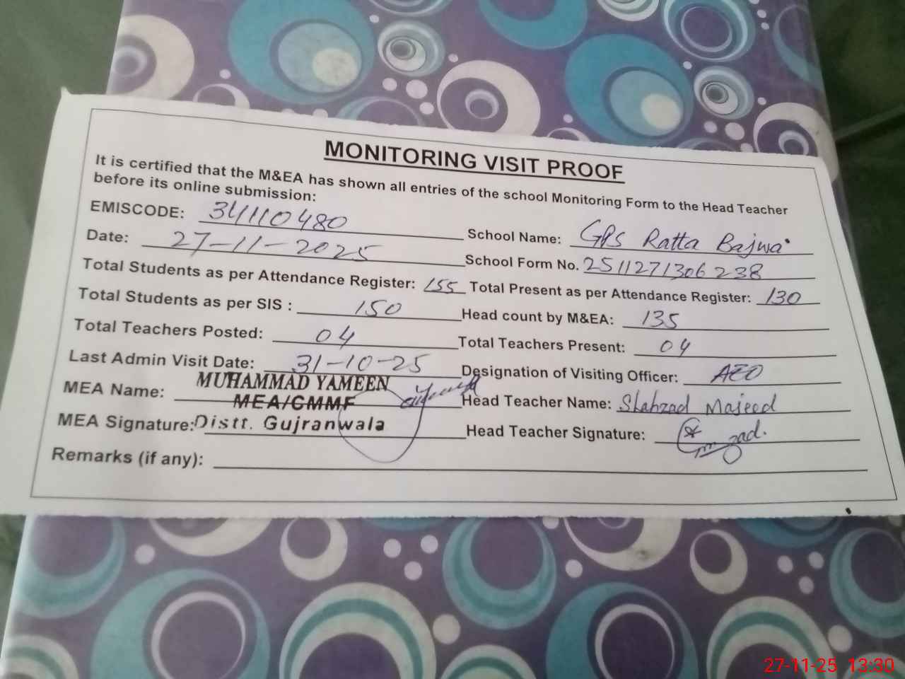 | EMIS Code: 34110480 | Name of School: GPS RATTA BAJWA | |||
