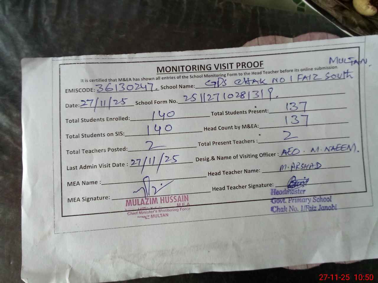 | Attendance Register | Head Teacher | MEA with School | Visit Proof |