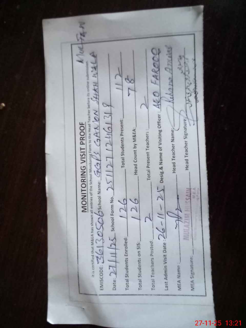 | Attendance Register | Head Teacher | MEA with School | Visit Proof |