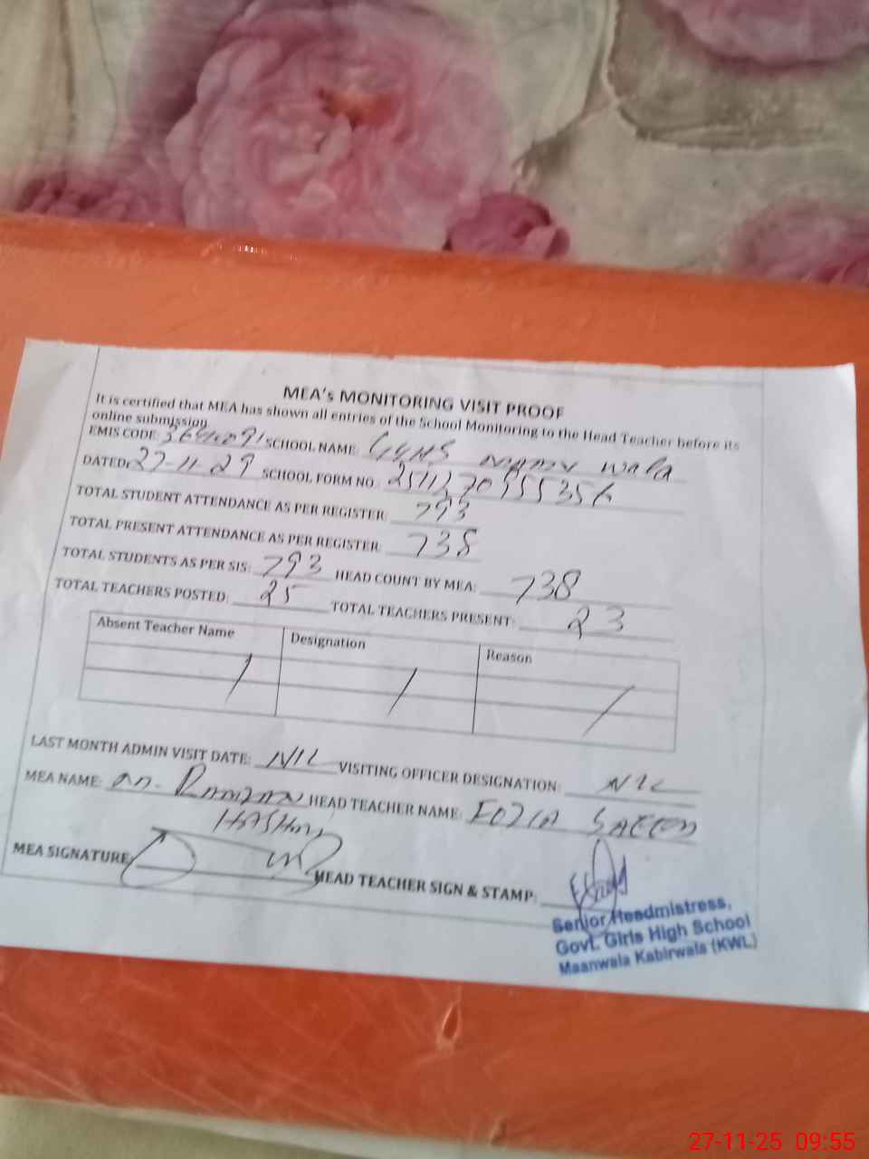 | Attendance Register | Head Teacher | MEA with School | Visit Proof |