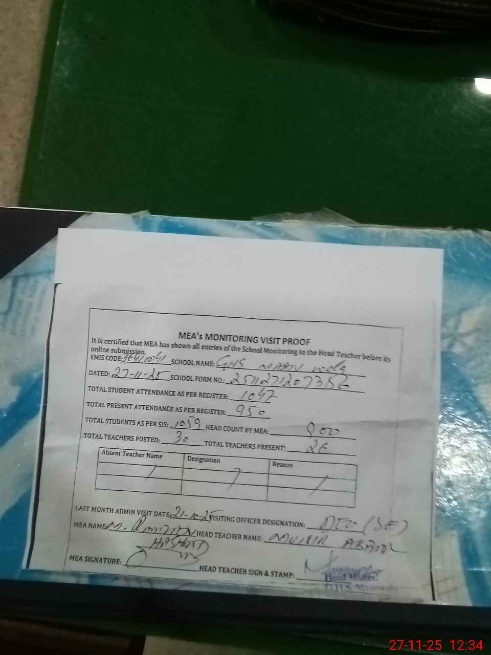| Attendance Register | Head Teacher | MEA with School | Visit Proof |