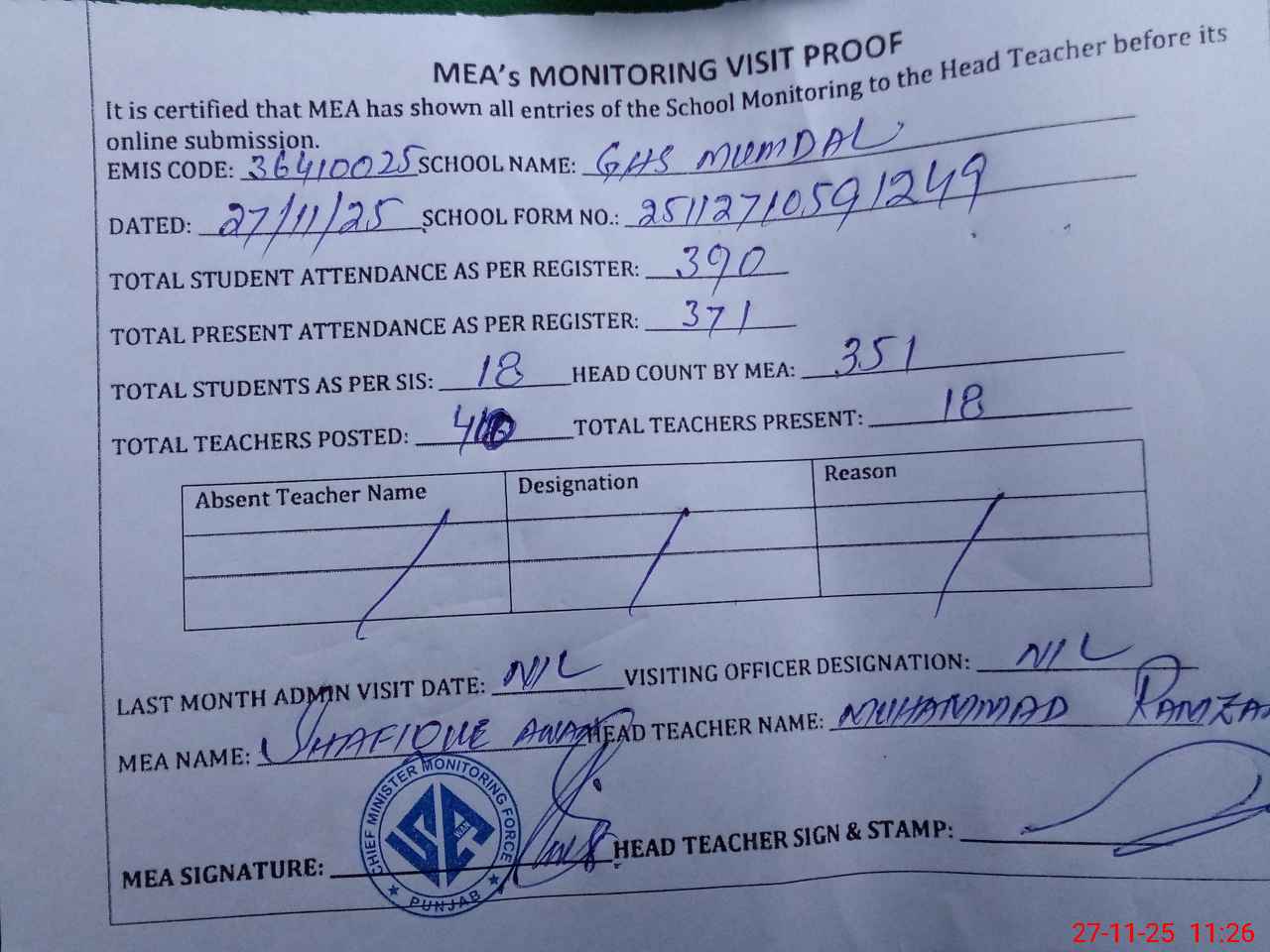 | EMIS Code: 36410025 | Name of School: GHS MUMDAL, NAWAN SHEHR | |||