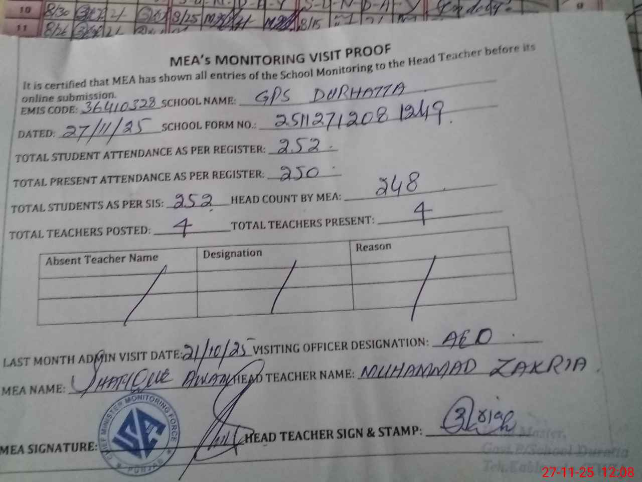 | Attendance Register | Head Teacher | MEA with School | Visit Proof |