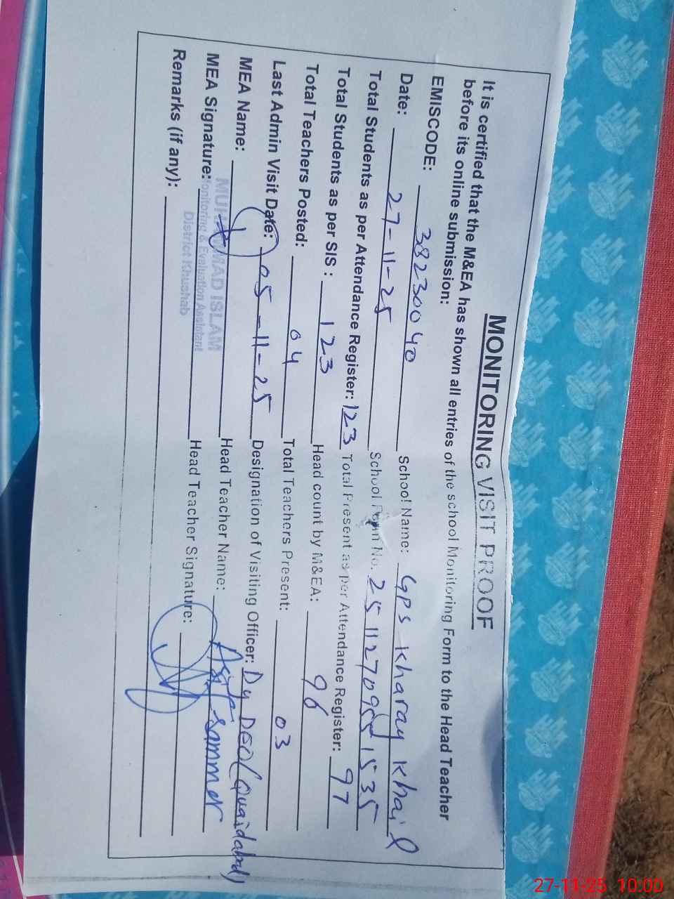 | EMIS Code: 38230040 | Name of School: GPS KHARAY KHAIL | |||