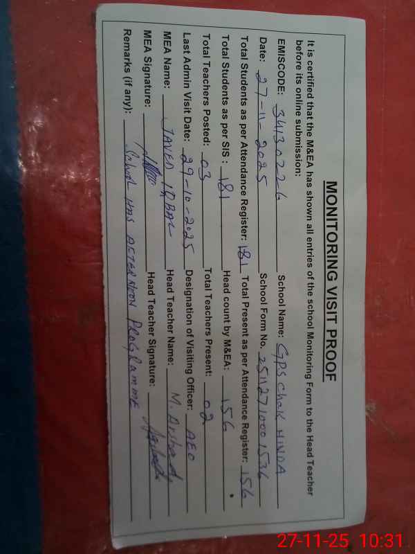 | EMIS Code: 34130226 | Name of School: GPS CHAK HINDA | |||