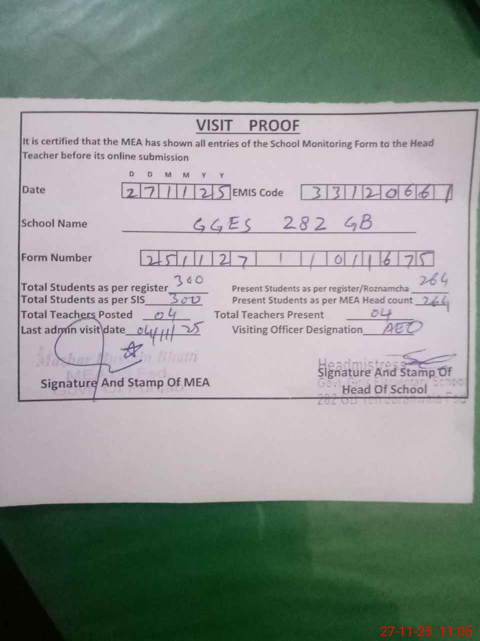 | EMIS Code: 33120661 | Name of School: GGES CHAK 282 GB SATIANA | |||