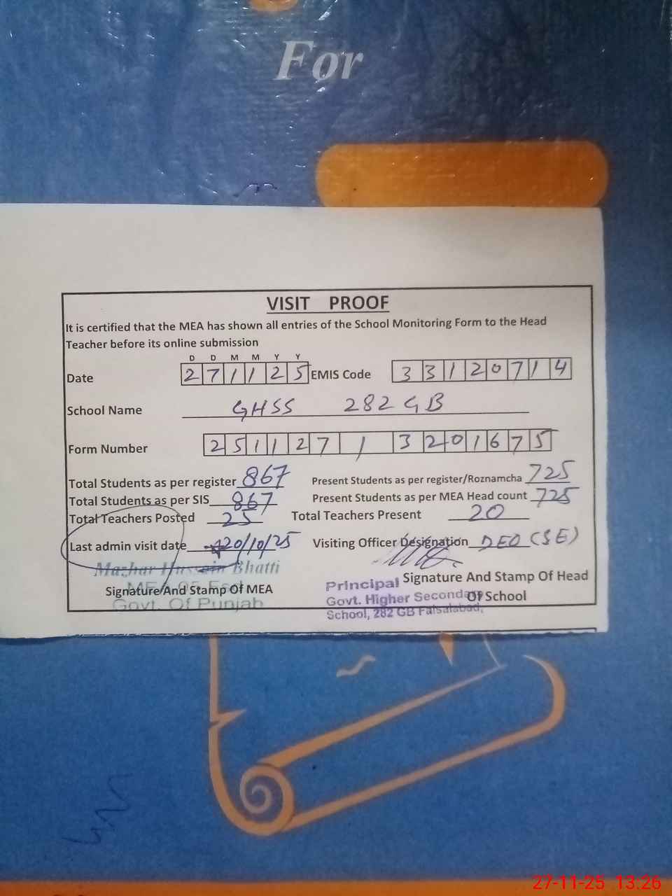 | Attendance Register | Head Teacher | MEA with School | Visit Proof |
