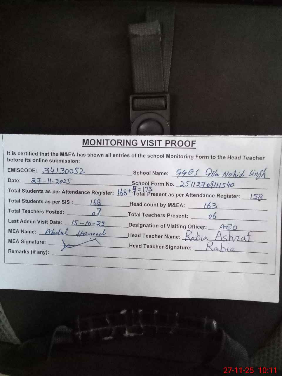 | Attendance Register | Head Teacher | MEA with School | Visit Proof |