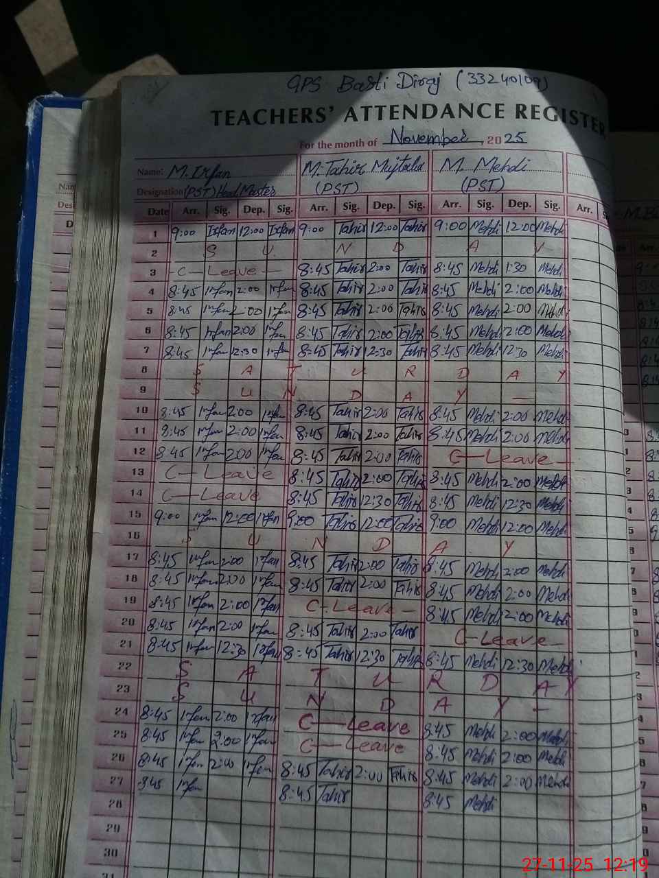| Name: Mu**** Ir**** Designation: (School Headmaster's/Headmistress's) PST Phone/Cell Number: 03**** |