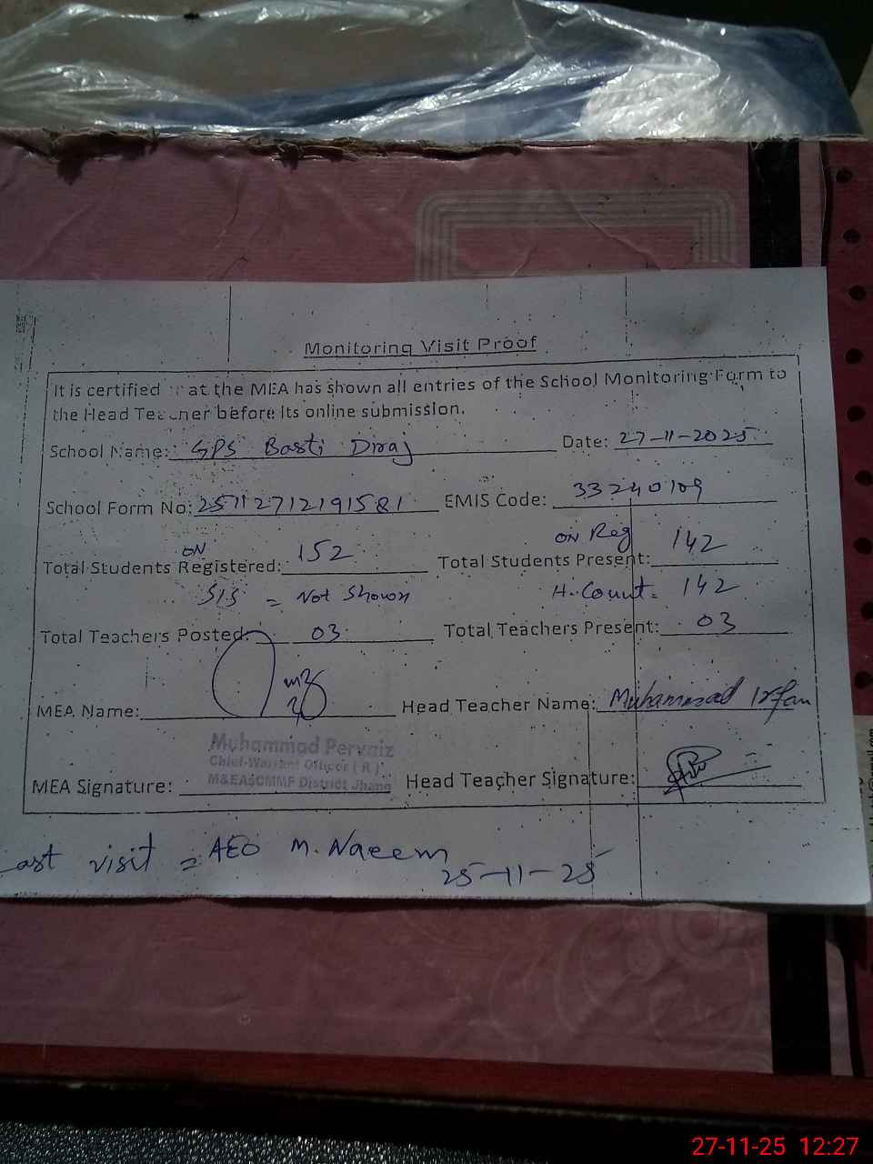 | Attendance Register | Head Teacher | MEA with School | Visit Proof |