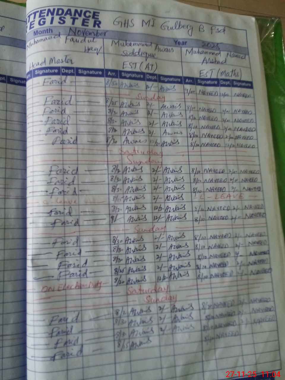 | CNIC | Full Name | Designation | R/C | Absence During Last Calender Month |