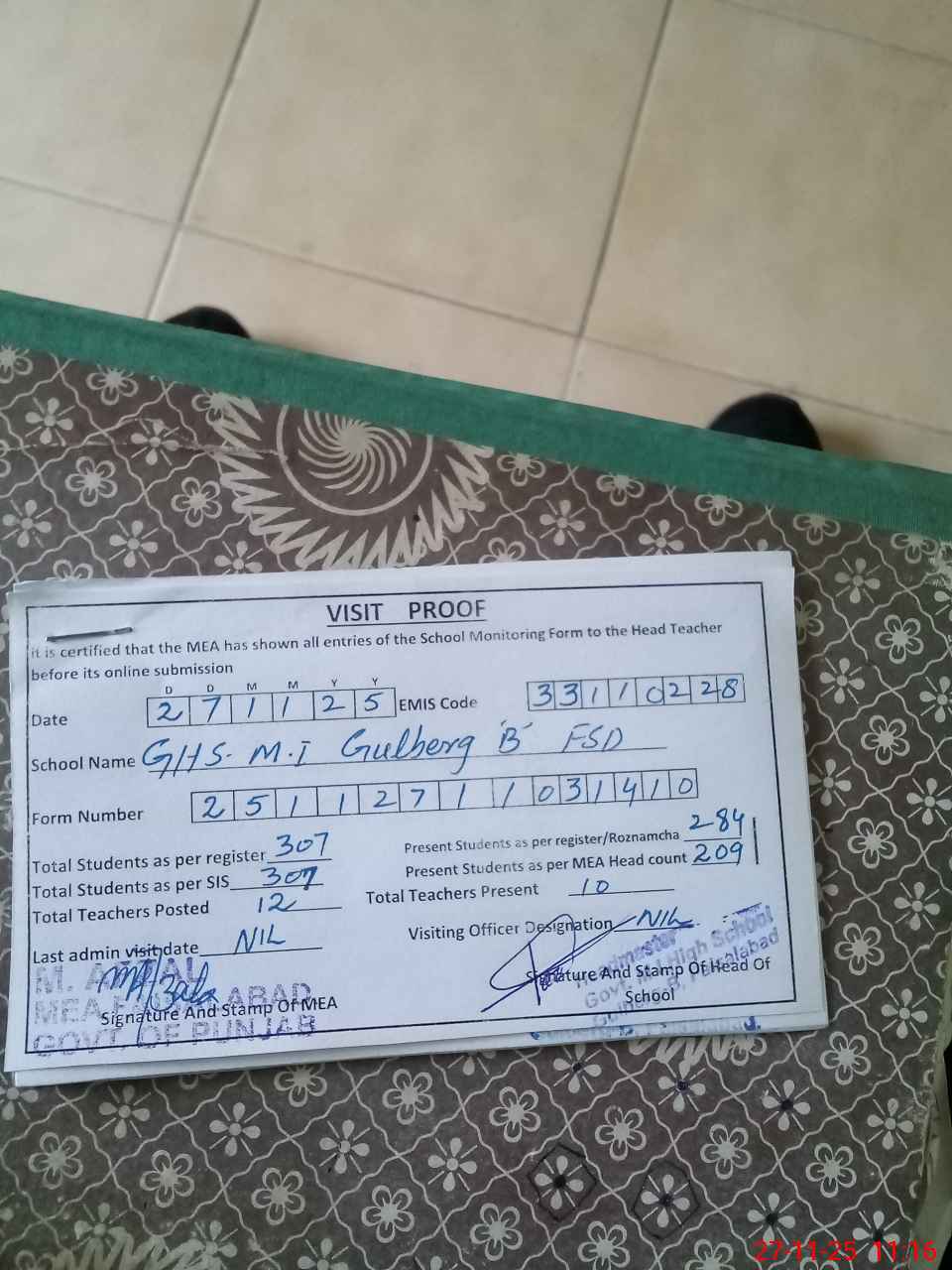 | Attendance Register | Head Teacher | MEA with School | Visit Proof |