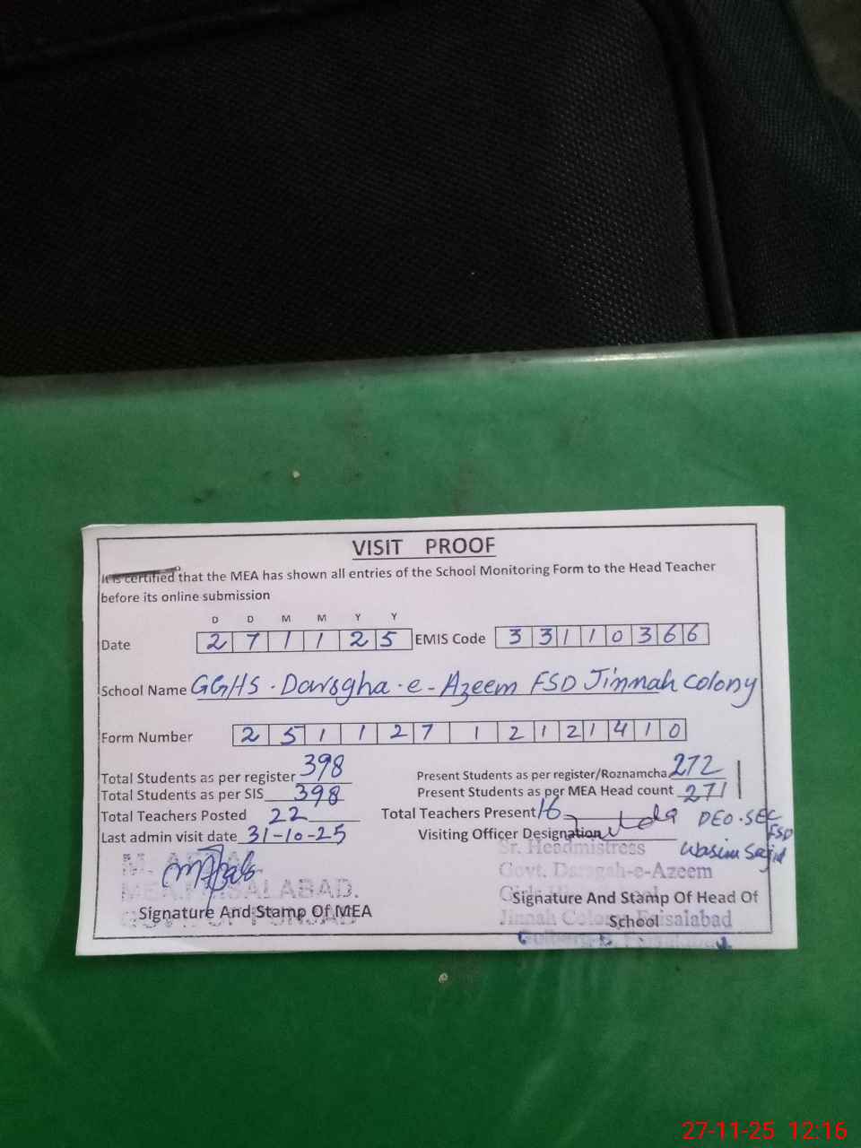 | EMIS Code: 33110366 | Name of School: GGHS DARSGHA I AZEEM FSD JINNAH COLONY | |||