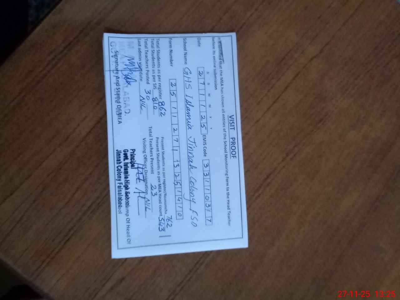 | EMIS Code: 33110317 | Name of School: GHS ISLAMIA JINNAH COLONY FSD | |||
