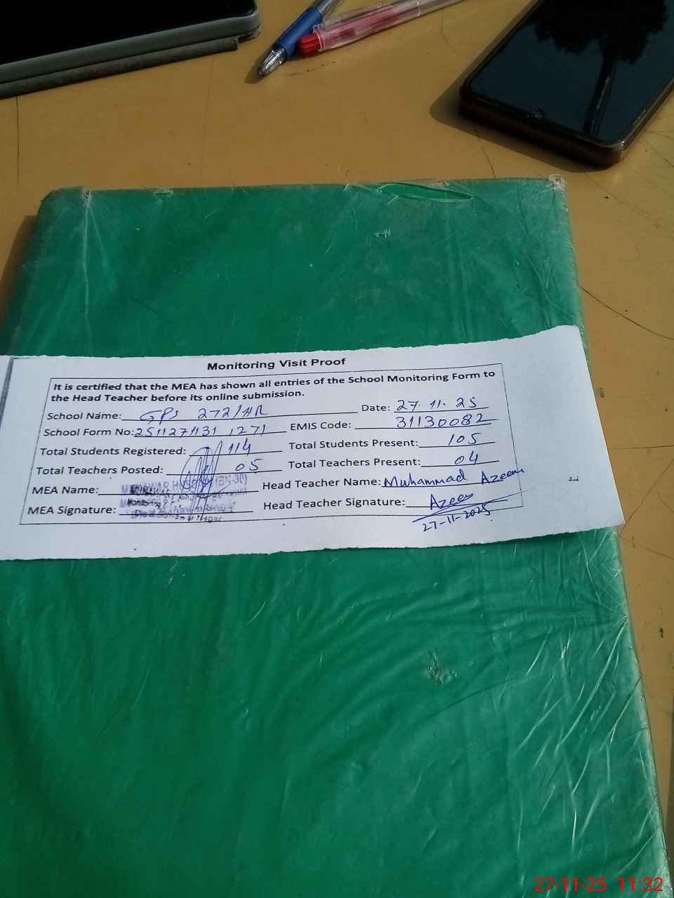 | Attendance Register | Head Teacher | MEA with School | Visit Proof |