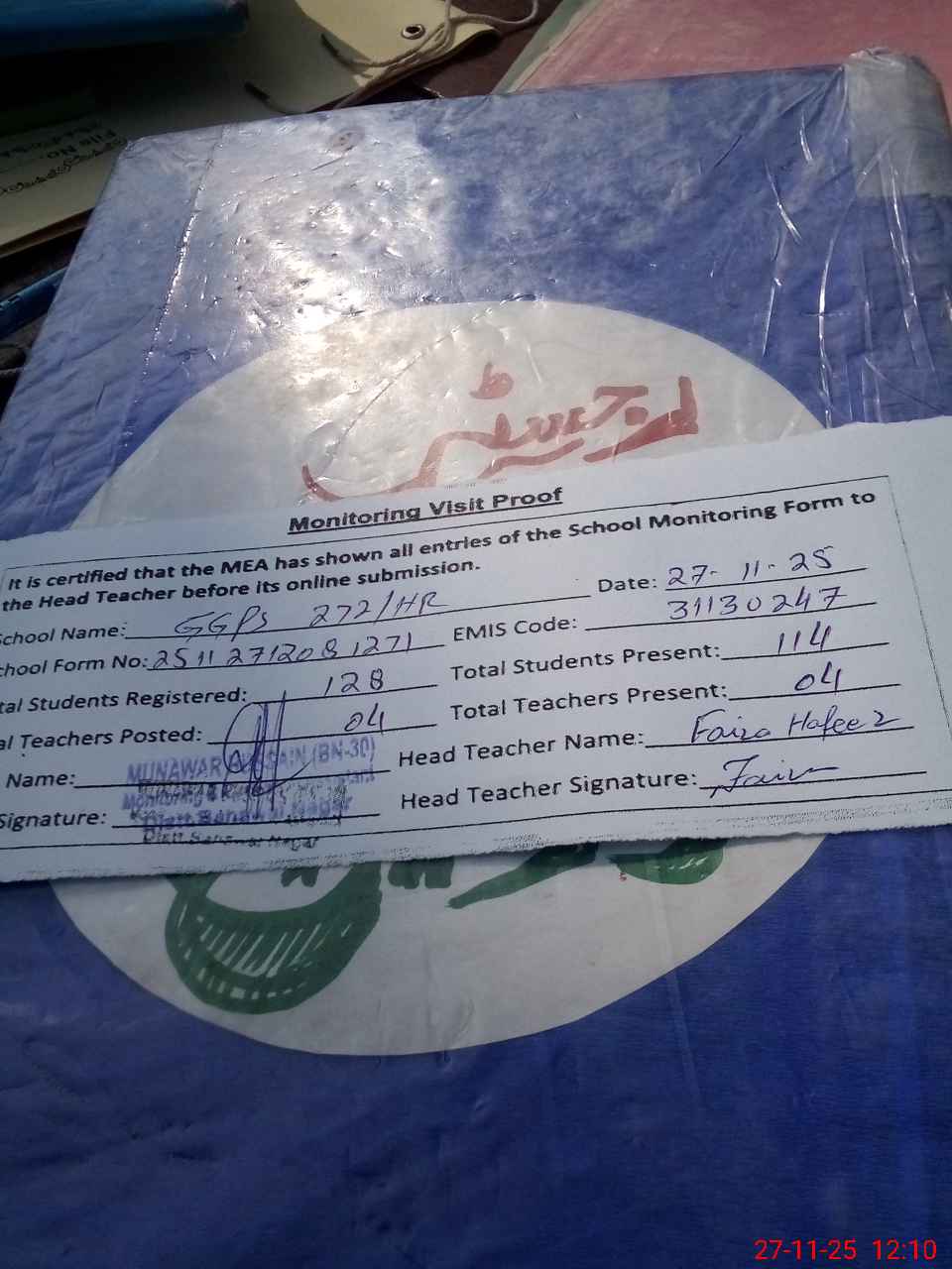 | Attendance Register | Head Teacher | MEA with School | Visit Proof |