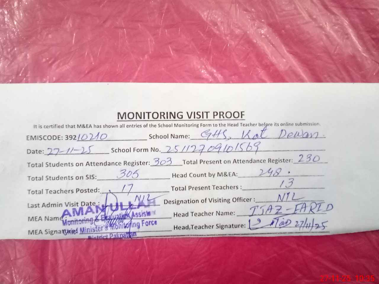 | EMIS Code: 39210210 | Name of School: GHS KOT DEWAN PO PAKPATTAN | |||