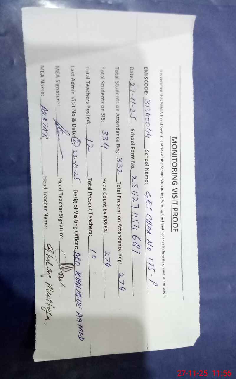 | EMIS Code: 31340044 | Name of School: GES CHAK NO 175/P | |||