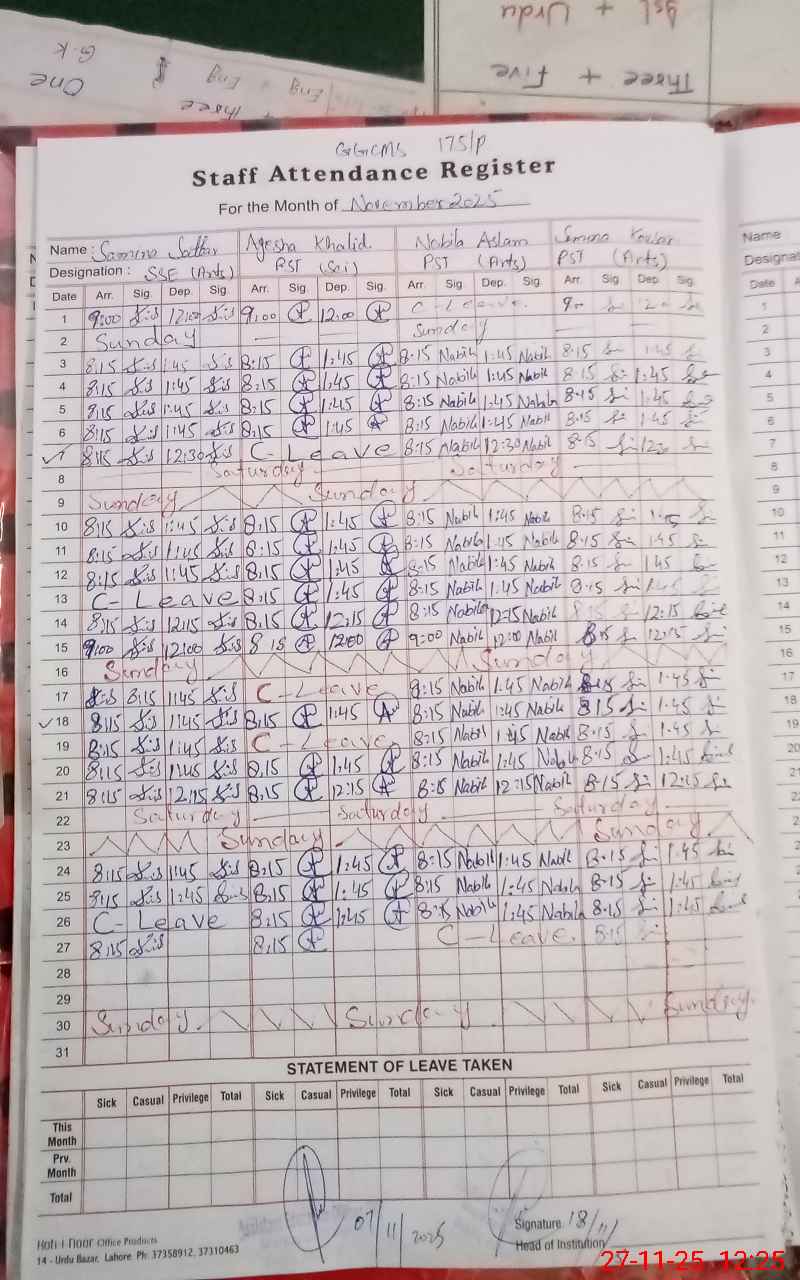 | CNIC | Full Name | Designation | R/C | Absence During Last Calender Month |
