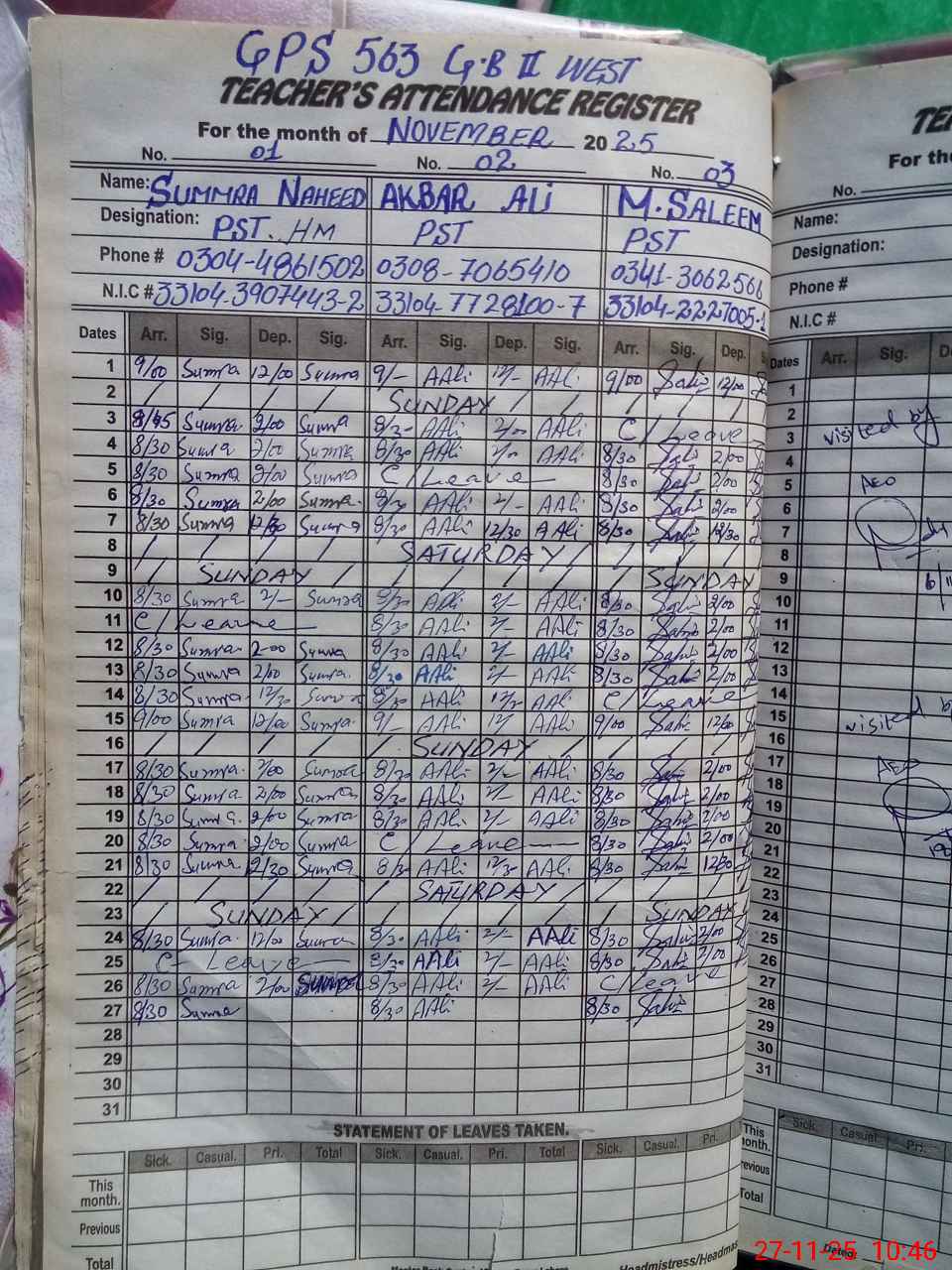 | CNIC | Full Name | Designation | R/C | Absence During Last Calender Month |