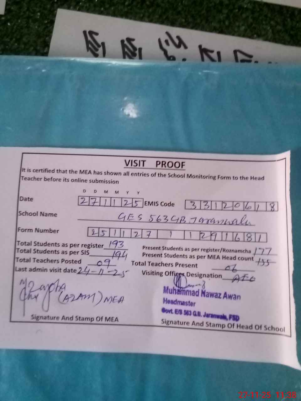 | Attendance Register | Head Teacher | MEA with School | Visit Proof |
