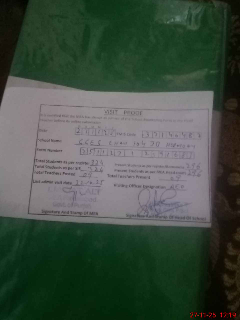 | Attendance Register | Head Teacher | MEA with School | Visit Proof |