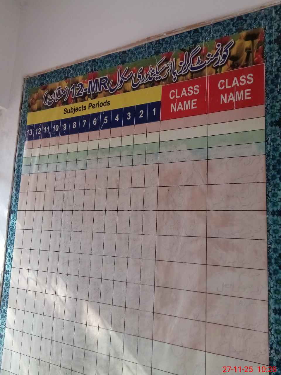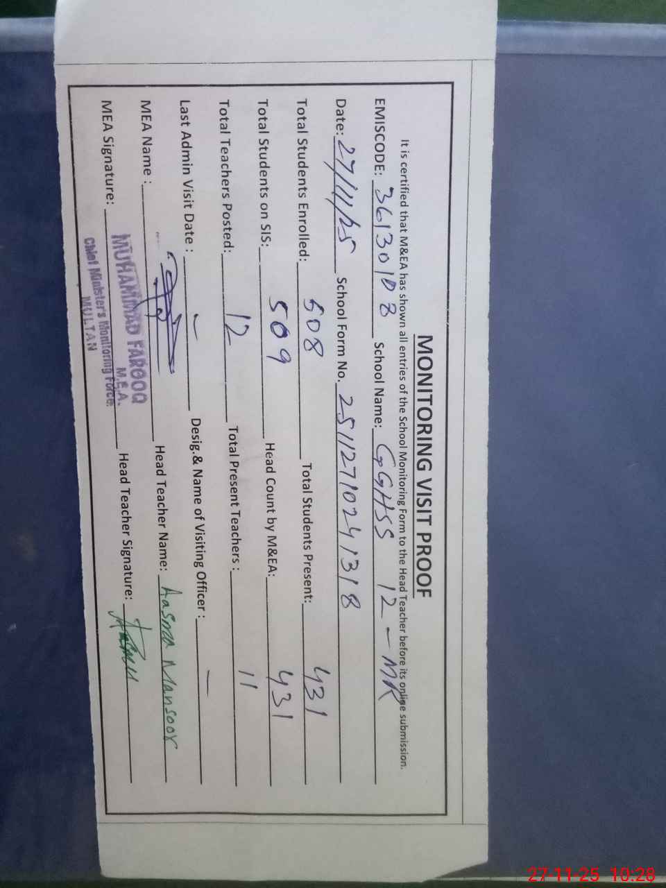 | EMIS Code: 36130108 | Name of School: GGHSS CHAK NO. 12-MR SADDAR MULTAN | |||