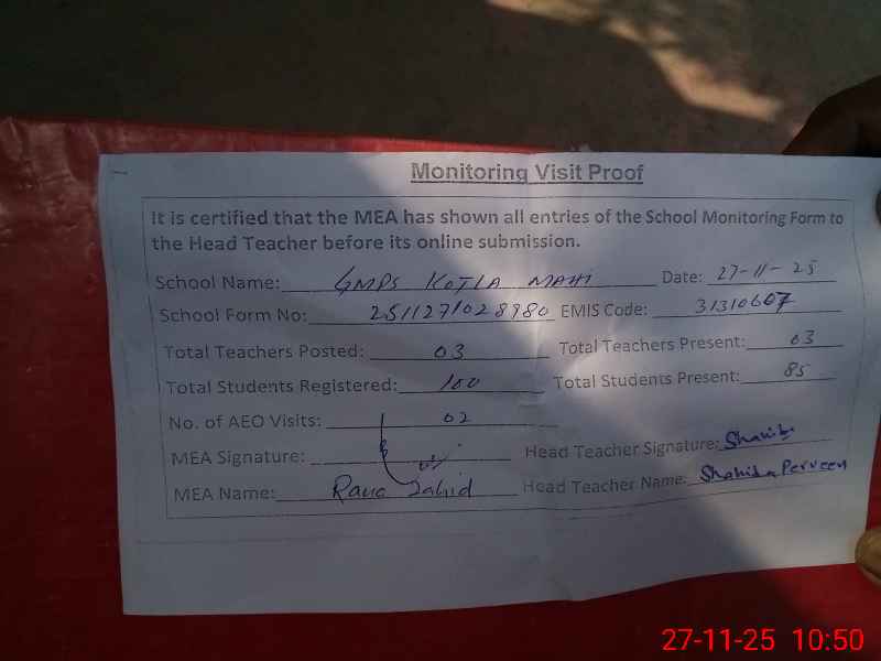 | EMIS Code: 31310607 | Name of School: GMPS KOTLA MAHI | |||