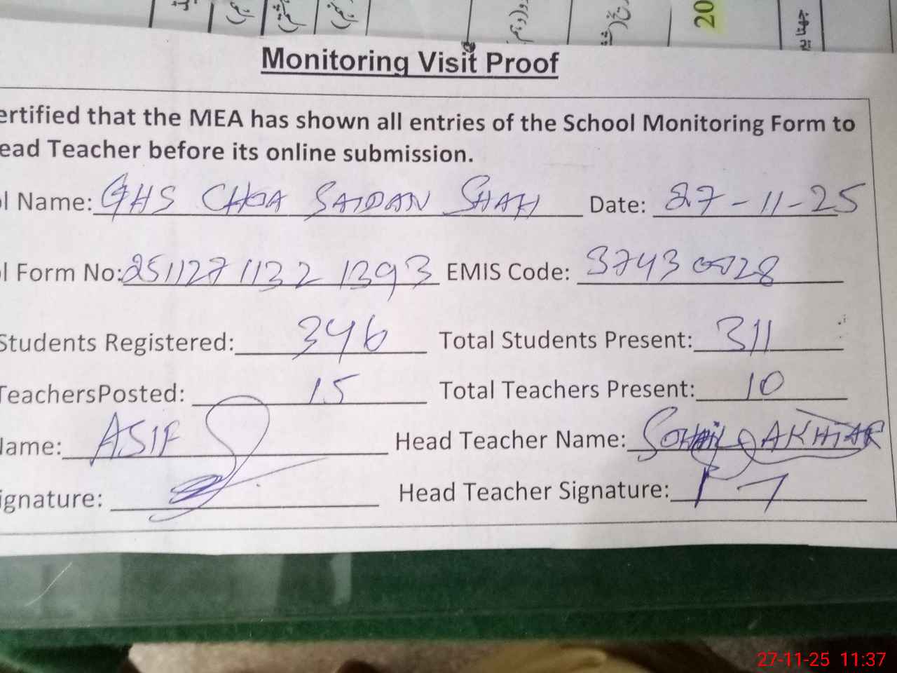 | Attendance Register | Head Teacher | MEA with School | Visit Proof |