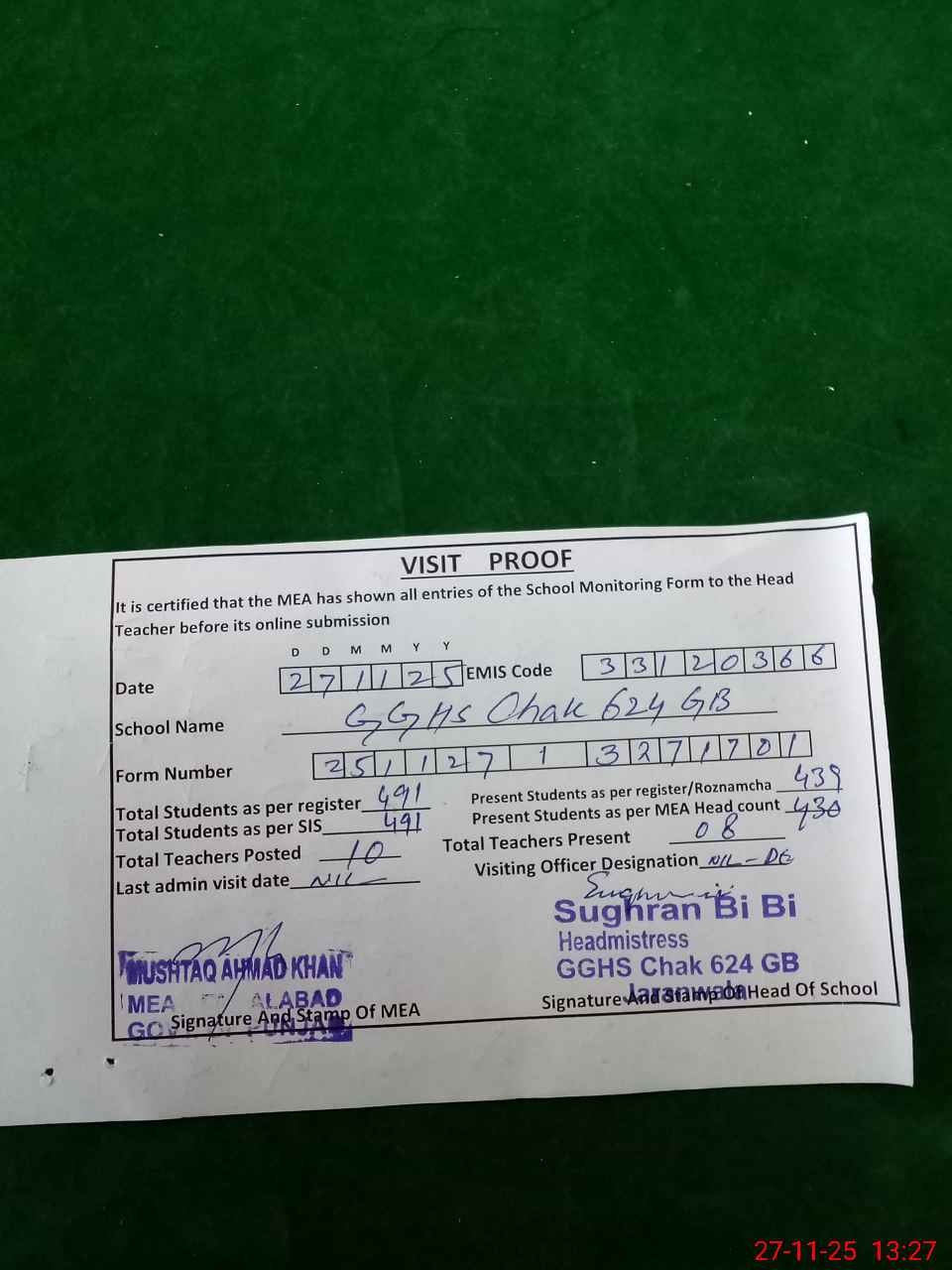 | Attendance Register | Head Teacher | MEA with School | Visit Proof |