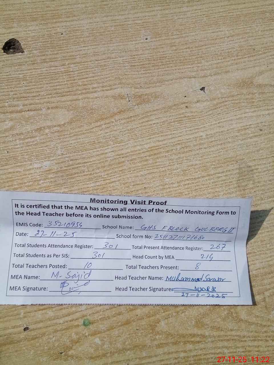 | EMIS Code: 35210954 | Name of School: GHS F-BLOCK GULBERG-II LAHORE | |||