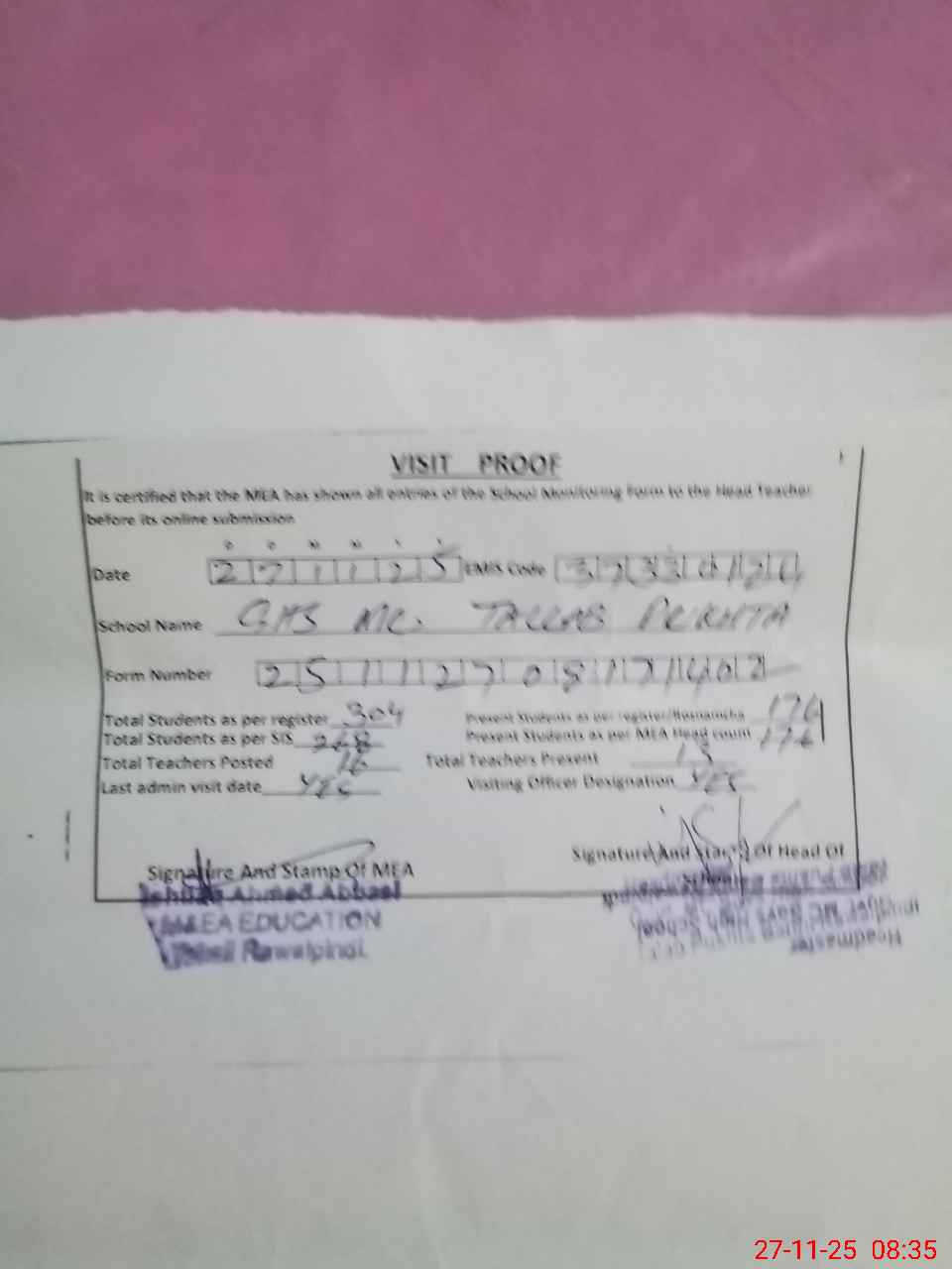 | Attendance Register | Head Teacher | MEA with School | Visit Proof |