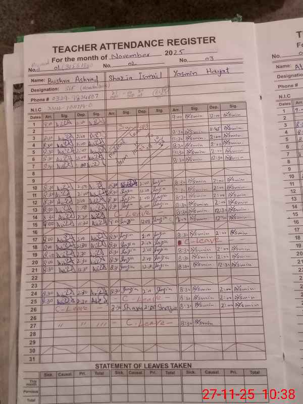 | CNIC | Full Name | Designation | R/C | Absence During Last Calender Month |
