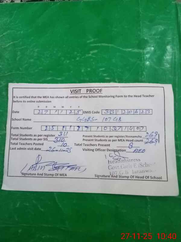 | EMIS Code: 33120623 | Name of School: GGES 107/GB PATHAN KOT | |||
