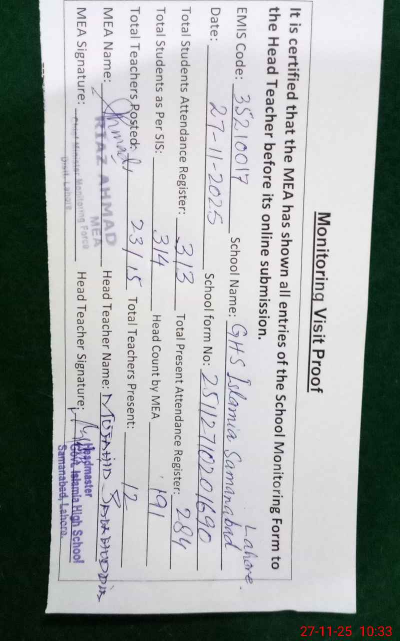 | EMIS Code: 35210017 | Name of School: GHS ISLAMIA SAMANABAD | |||