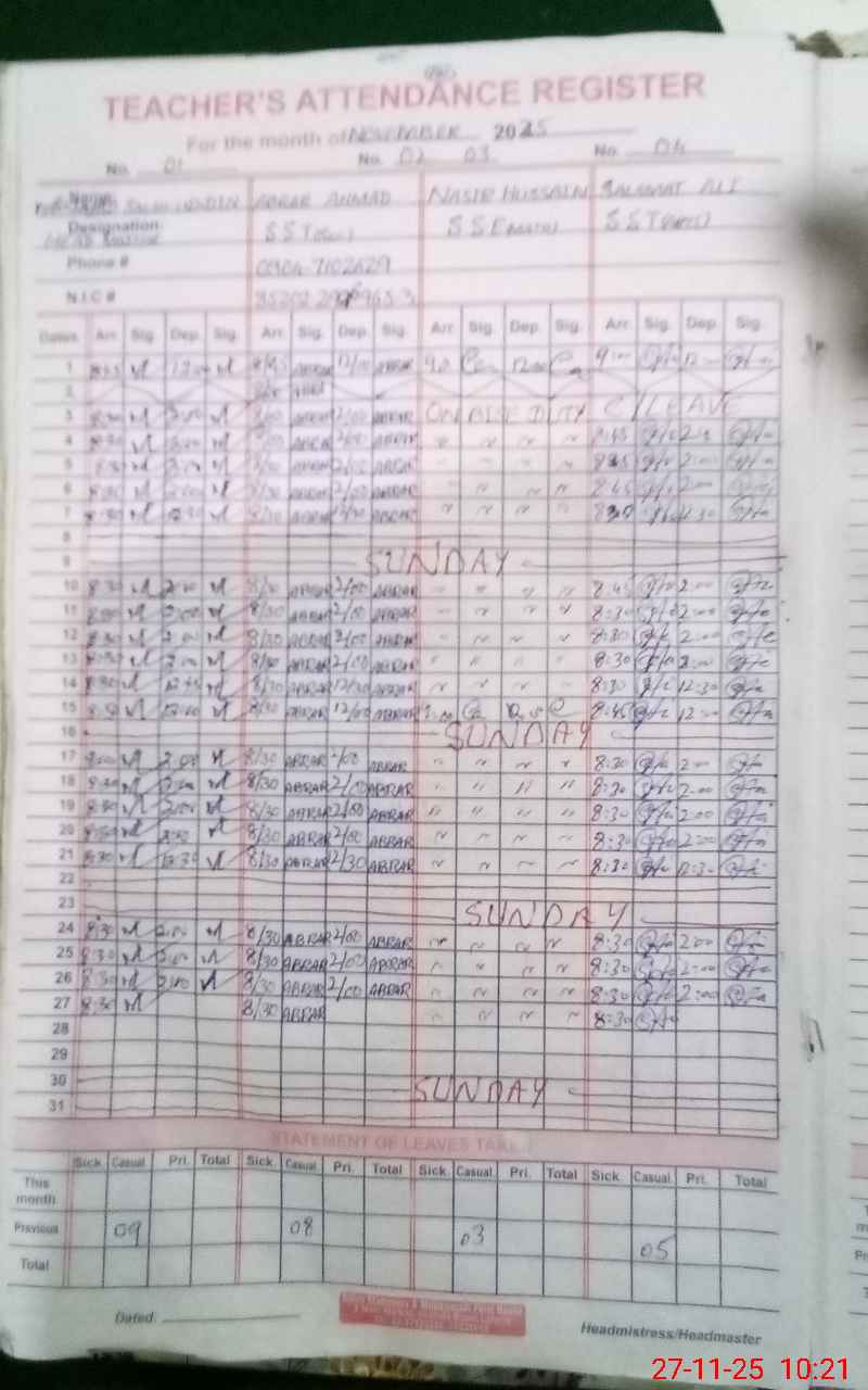| Remarks (Use Separate Page if Required): Teacher Safder Zahid IT is absent since 30 march ,2025 FTF account not active, non functional Two toilets are non functional No administrative visit during 2025 Repair and maintenance is required Roznamcha shows 284 students present whereas after head count 191 students are present Difference is 93 students | |||||