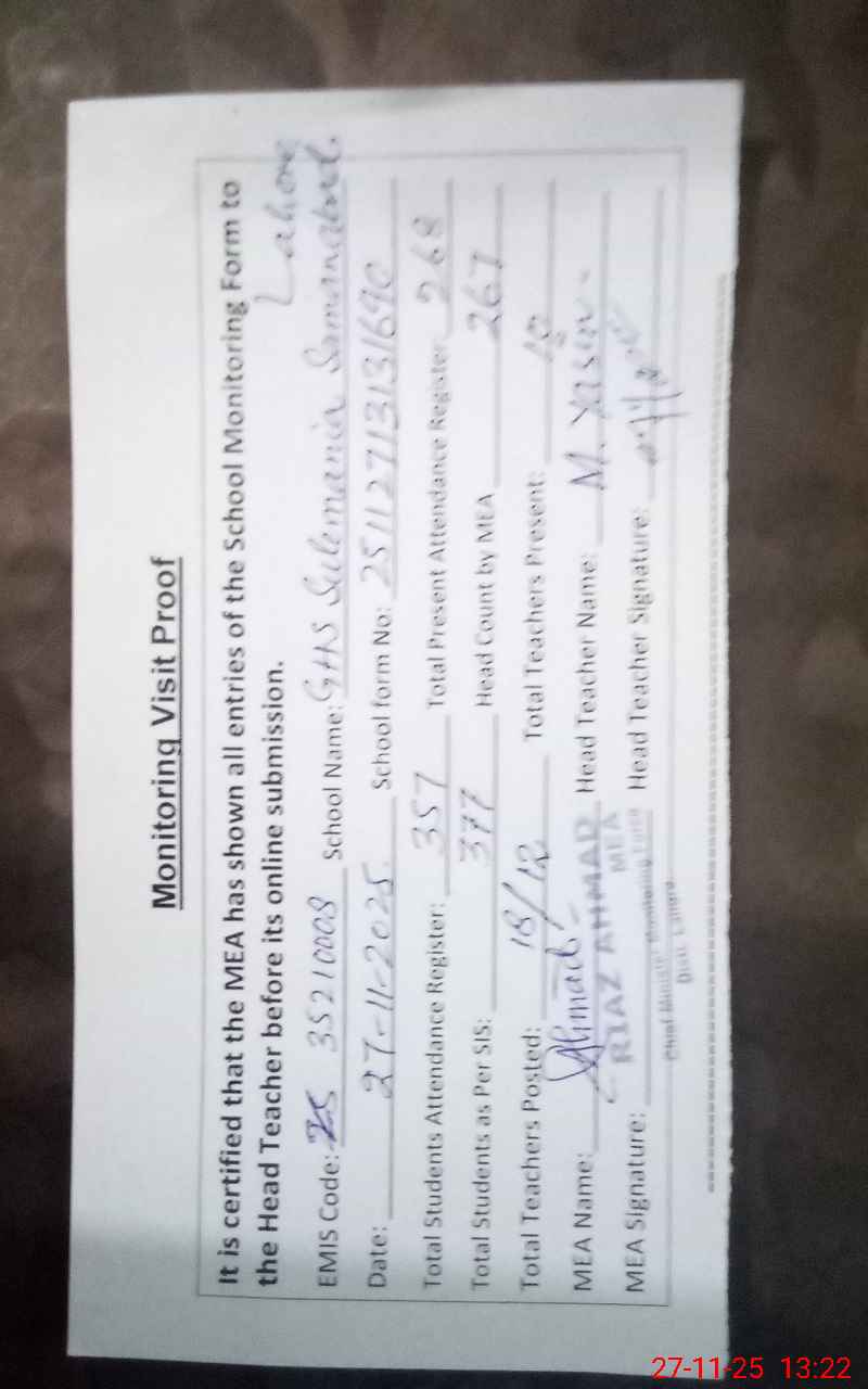 | Remarks (Use Separate Page if Required): Deputy secretary SED ER visited on 21 November 2025 CEO Lahore visited on 19 October 2025 Teacher Muhammad Ramzan is absent since 22 October 2025 | |||||