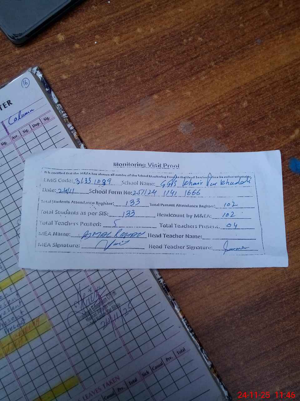 | Attendance Register | Head Teacher | MEA with School | Visit Proof |