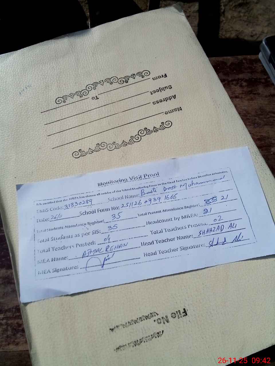 | Attendance Register | Head Teacher | MEA with School | Visit Proof |