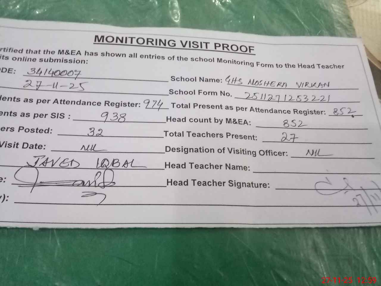 | Attendance Register | Head Teacher | MEA with School | Visit Proof |