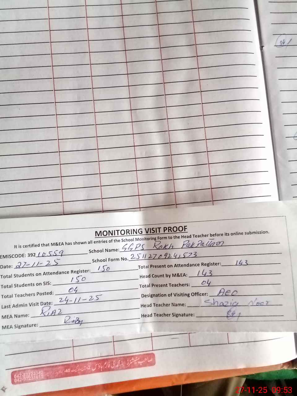 | Attendance Register | Head Teacher | MEA with School | Visit Proof |