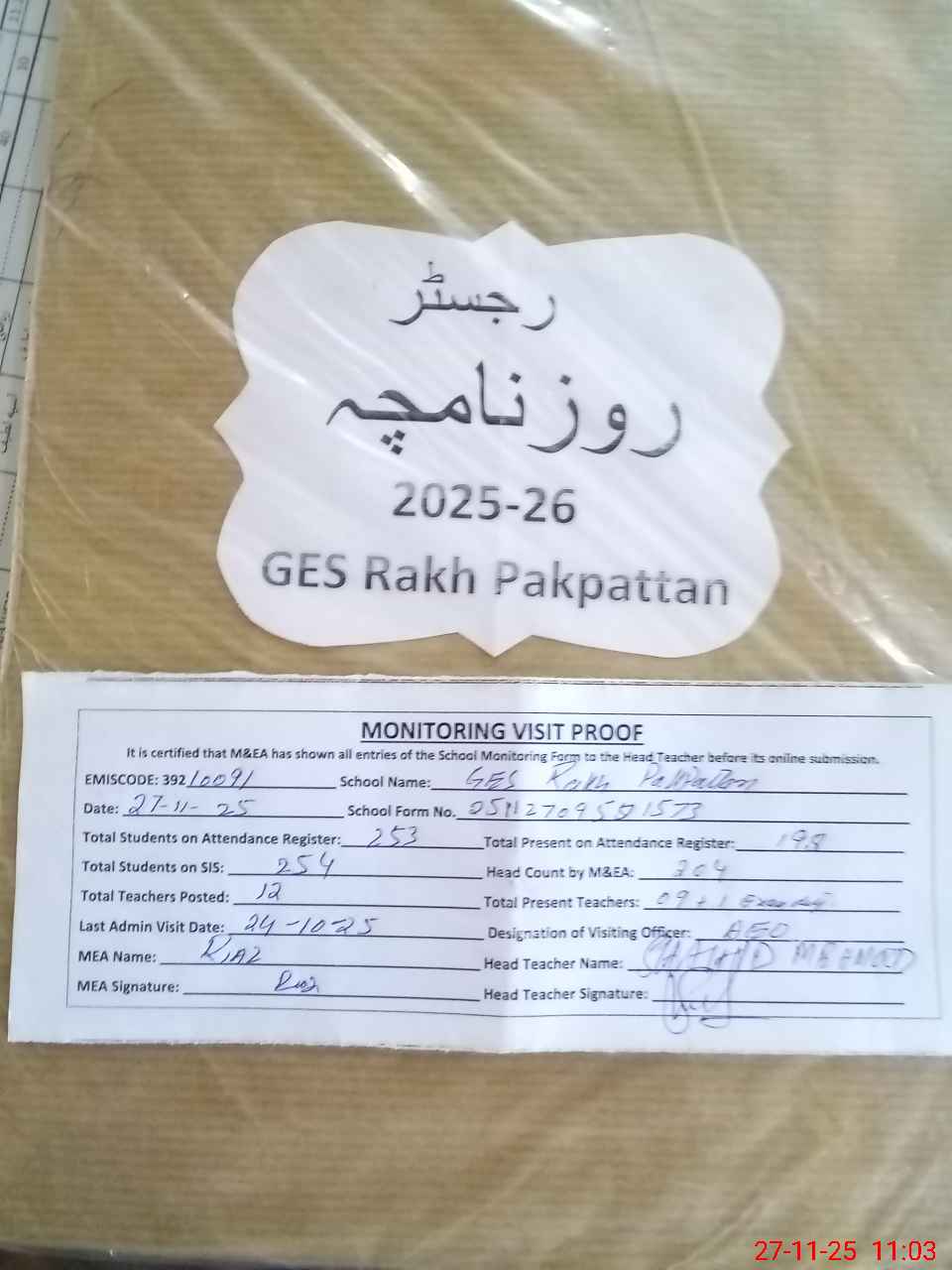 | Attendance Register | Head Teacher | MEA with School | Visit Proof |