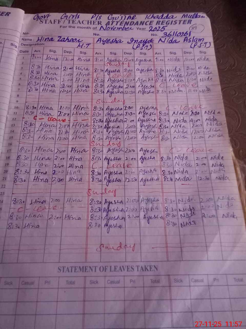 | CNIC | Full Name | Designation | R/C | Absence During Last Calender Month |