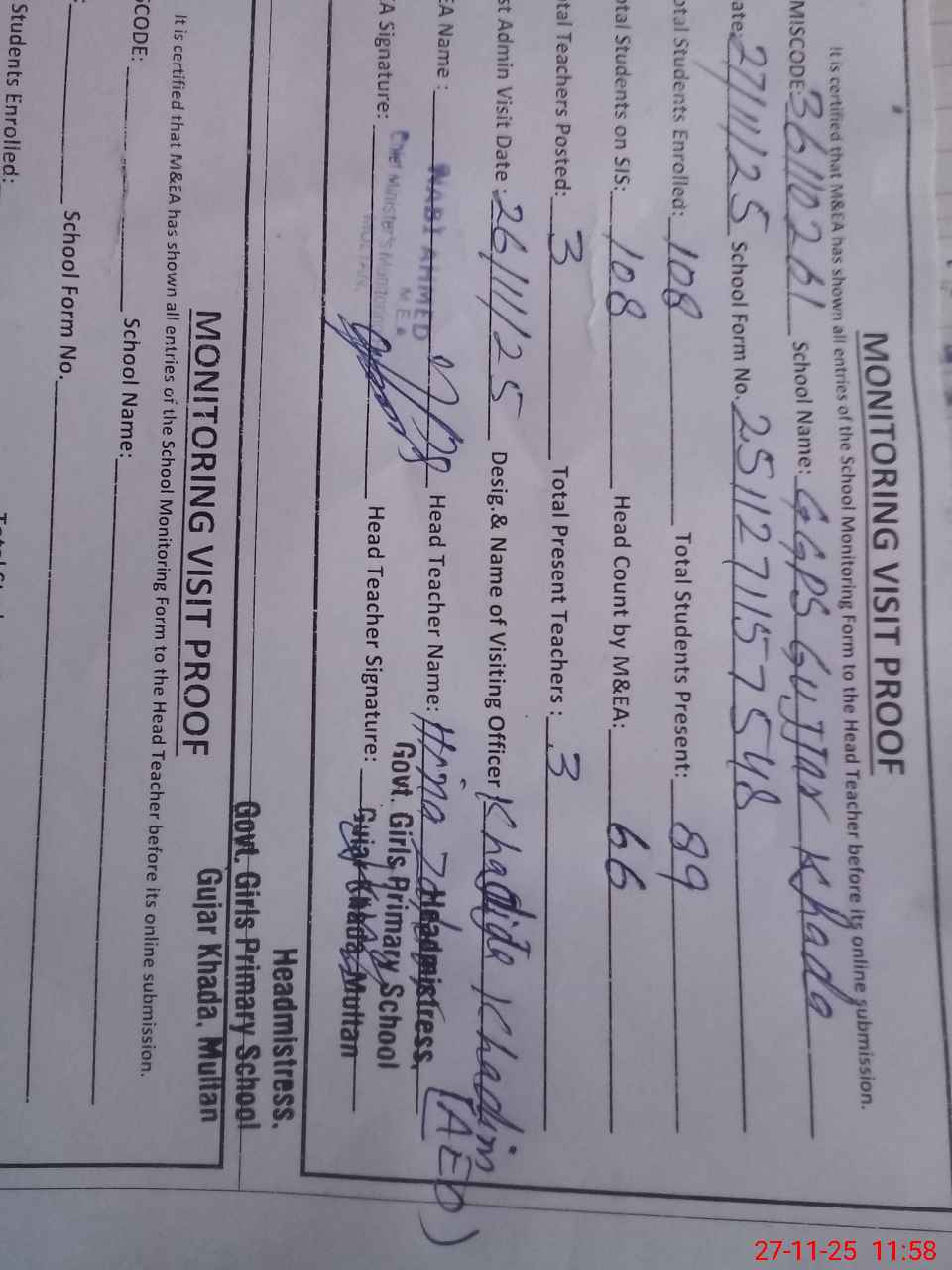 | EMIS Code: 36110261 | Name of School: GGPS GUJJAR KHADA MULTAN | |||