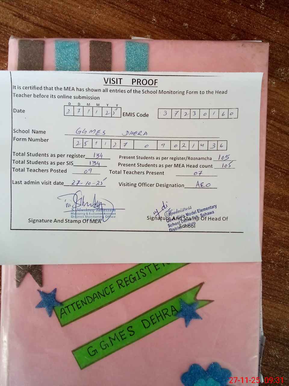 | Attendance Register | Head Teacher | MEA with School | Visit Proof |