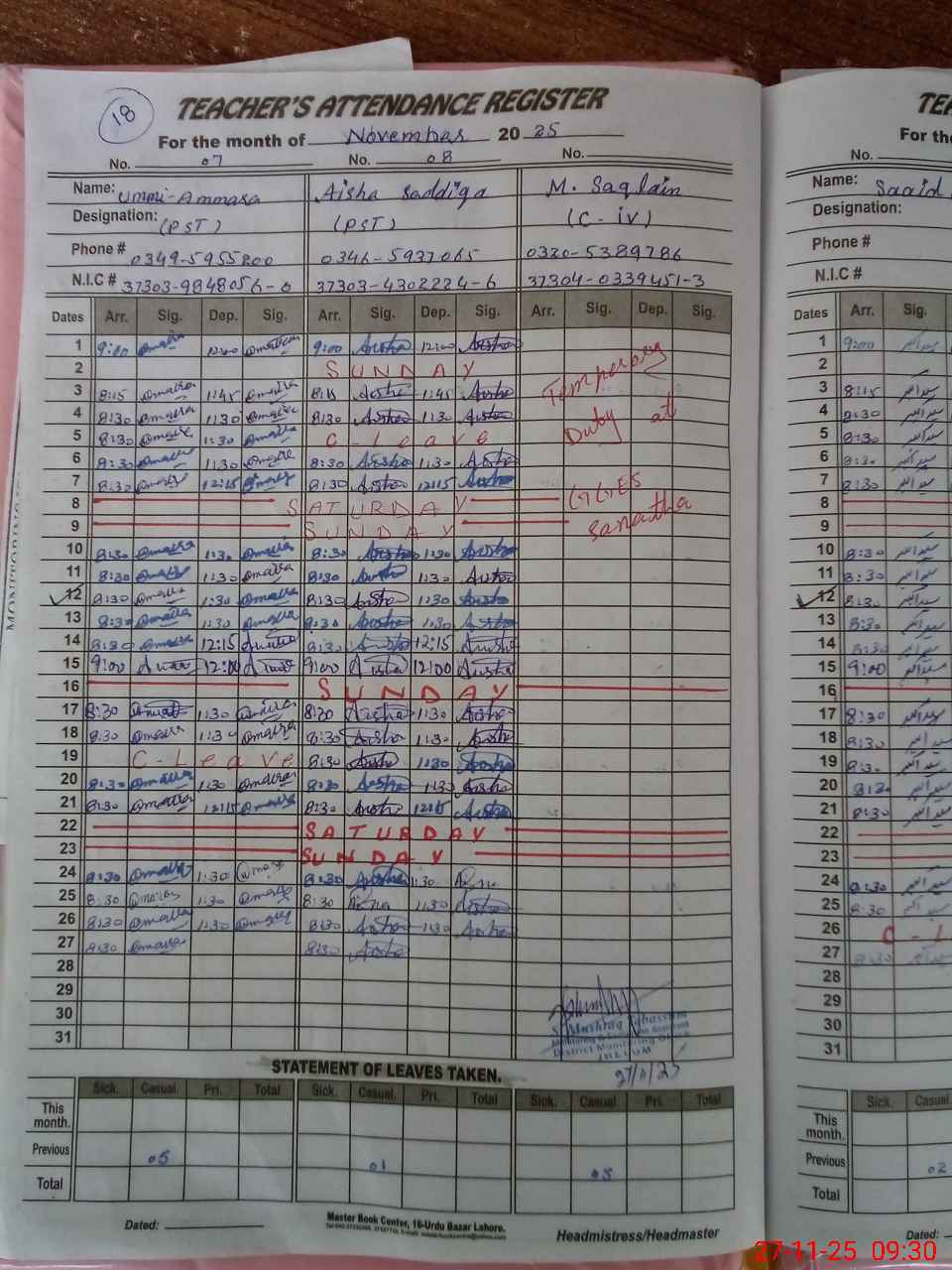 | CNIC | Full Name | Designation | R/C | Absence During Last Calender Month |