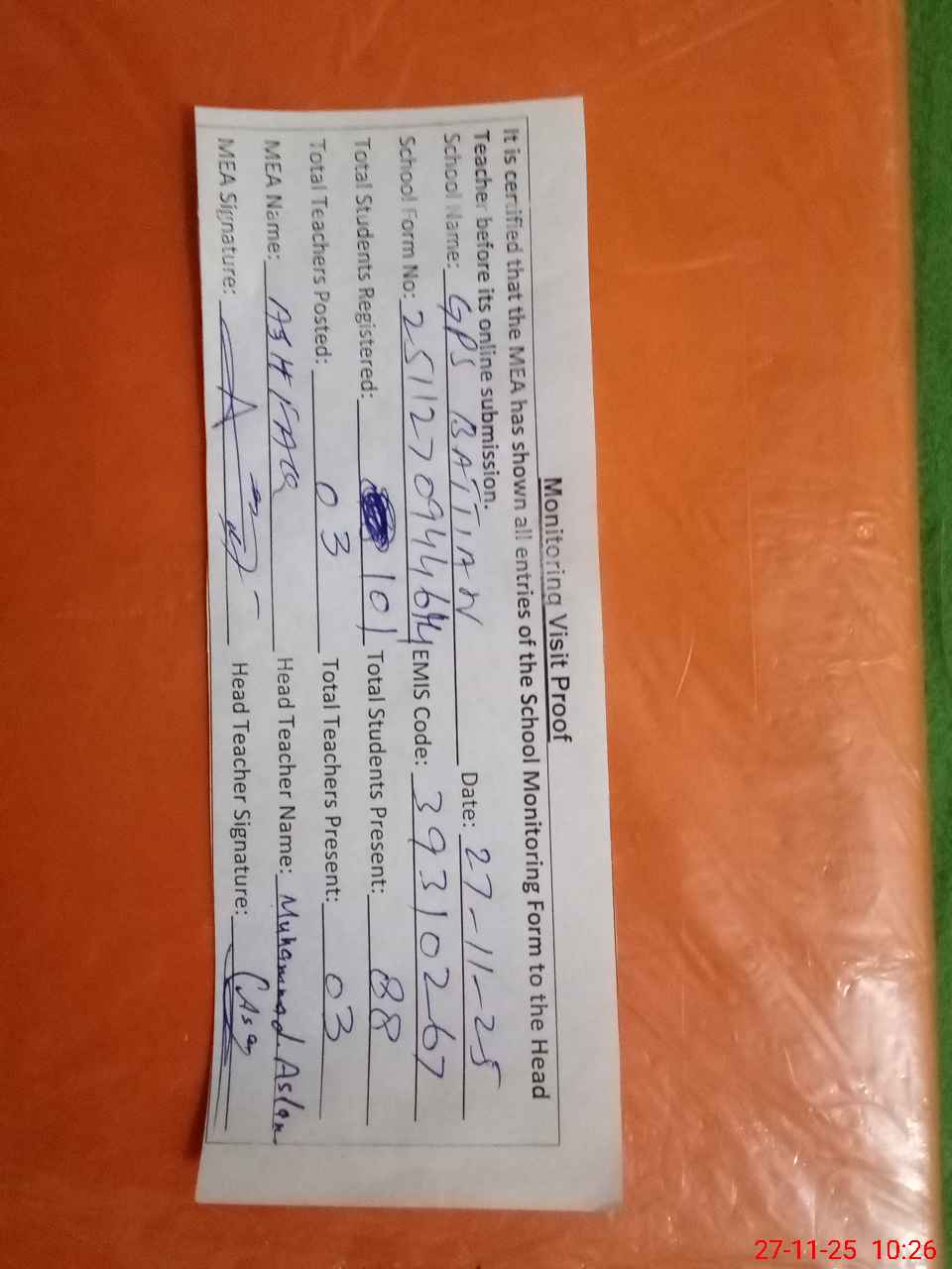 | Attendance Register | Head Teacher | MEA with School | Visit Proof |