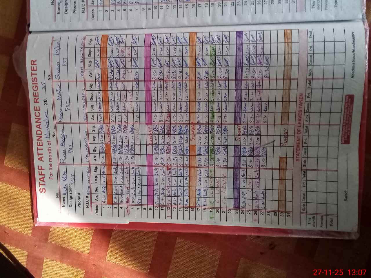 | CNIC | Full Name | Designation | R/C | Absence During Last Calender Month |