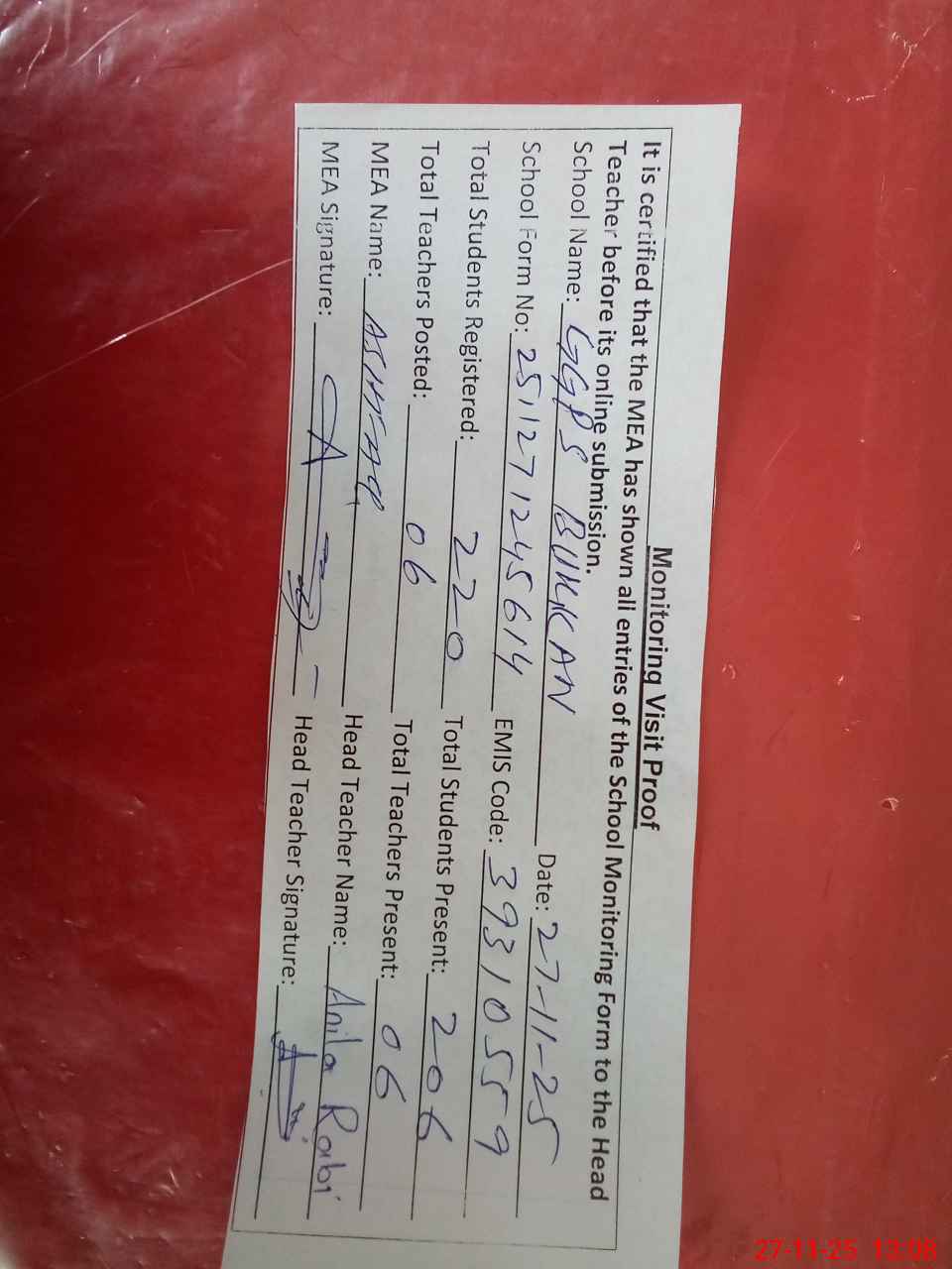 | Attendance Register | Head Teacher | MEA with School | Visit Proof |